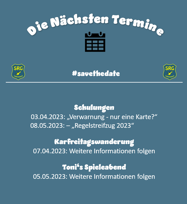 Die nächste Schulung findet am Montag den 03.04 in Eglosheim statt. Thema: „Verwarnung – nur eine Karte?“. Die Schulung im Monat Mai wird dann das Thema „Regelstreifzug 2023“ beleuchten.