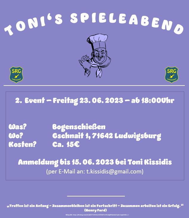 Nachdem der ursprüngliche Termin am vergangenen Freitag, 08.05.2023 wortwörtlich ins Wasser gefallen ist, wird Toni’s Spieleabend neu angesetzt.