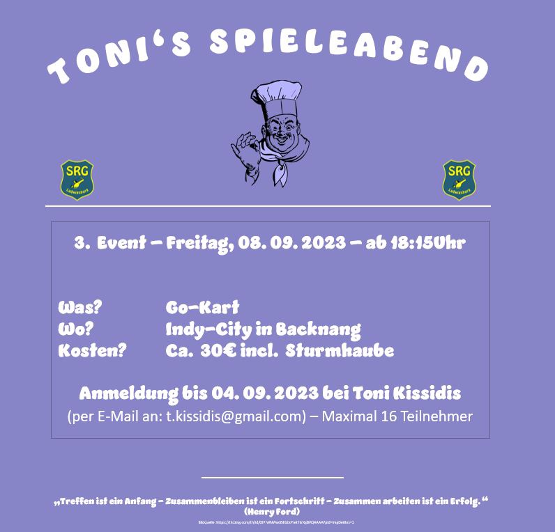 Unser Spieleabend geht in die nächste Runde! Wir treffen uns am 08.09.2023 in Backnang zum Go-Kart fahren.